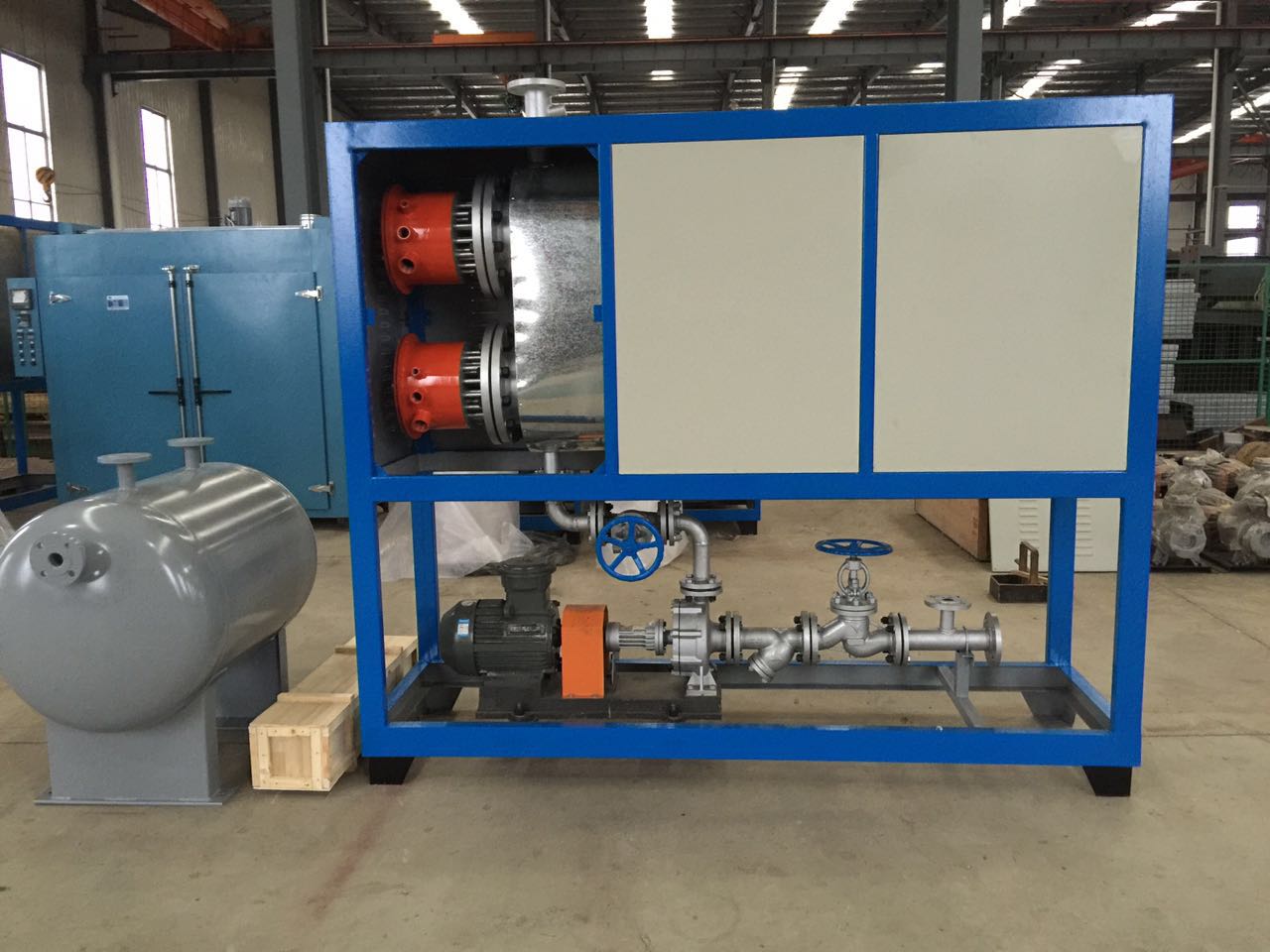 導(dǎo)熱油爐排氣流程: 1、導(dǎo)熱油通過膨脹槽注油口處加注,并通過膨脹口管道流入設(shè)備及油爐本體內(nèi),此時(shí)注油時(shí)一定要打開系統(tǒng)中所有的閥門(放油閥除外),讓導(dǎo)熱油流入筒體及需加熱設(shè)備內(nèi)。 2、當(dāng)液面顯示約為膨脹槽高度1/2時(shí),停止注油。 3、首 行常溫排氣:接通電源,打開導(dǎo)熱油加熱器的進(jìn)出口閥門及排氣閥(膨脹管道閥門需一直開著以及時(shí)補(bǔ)充油量),按動(dòng)油泵啟動(dòng)按鈕,油泵運(yùn)行,油泵應(yīng)按箭頭指示方向正常運(yùn)行,壓力表壓力顯示在規(guī)定范圍內(nèi),視聽油泵運(yùn)行情況,如有異,F(xiàn)象應(yīng)立即停機(jī)檢查,將故障排除后再重新起動(dòng)油泵,進(jìn)行常溫下排氣,直至壓力表指示穩(wěn)定。進(jìn)行常溫排氣時(shí),要注意觀察膨脹槽內(nèi)的液位,當(dāng)?shù)陀谝?guī)定的液位高度時(shí)要及時(shí)進(jìn)行補(bǔ)充。 4、升溫脫水:在確認(rèn)常溫下運(yùn)行正常后,即可進(jìn)行升溫脫水排氣(操作前詳閱導(dǎo)熱油使用說明書及溫控儀使用說明書),升溫脫水排氣可按如下步驟進(jìn)行: 步:升溫至100-120℃保溫 開始升溫時(shí),應(yīng)該控制升溫速度在50℃/h以內(nèi),并且監(jiān)視壓力表顯示是否正常,如發(fā)現(xiàn)無壓力或壓力不穩(wěn),說明系統(tǒng)內(nèi)仍有殘留氣體,此時(shí)要求按3要求重復(fù)進(jìn)行常溫排氣操作,待系統(tǒng)壓力穩(wěn)定后方可繼續(xù),升溫至120℃后進(jìn)行長(zhǎng)時(shí)間保溫,保溫時(shí)間的長(zhǎng)短與系統(tǒng)總?cè)萘考皩?dǎo)熱油的質(zhì)量有關(guān)。  第二步:升溫至150-180℃保溫。  排除油中輕組分、揮發(fā)物及殘余水分,請(qǐng)參照KRD系列導(dǎo)熱油加熱器系統(tǒng)脫水排氣曲線圖操作 第三步:脫水排氣完成后要關(guān)閉排氣閥(其它閥門無需關(guān)閉),投入正常升溫運(yùn)行。 5、 升溫脫水排氣過程有關(guān)事項(xiàng)。 升溫過程中管路可能會(huì)發(fā)出碰擊的響聲,說明系統(tǒng)內(nèi)有大量氣體或管道不暢,此時(shí)要降低升溫速度,待氣體排除便可消除聲響;如系管道不暢所至應(yīng)予以排除。 脫水排氣過程可能會(huì)有大量氣體涌入膨脹槽,造成槽內(nèi)導(dǎo)熱油外溢,操作前要在溢油管下安置好溢油容器。 進(jìn)行脫水排氣時(shí),現(xiàn)場(chǎng)必須有人員看守,發(fā)現(xiàn)異常及時(shí)處理。   對(duì)于所提的油泵無油或少許油流出的問題,解決方案如下: 1、 關(guān)閉出油口閥門,啟動(dòng)油泵,觀察壓力表顯示情況,若無壓力,則說明回油口無油補(bǔ)充油泵,使得油泵空轉(zhuǎn),無后續(xù)油及時(shí)補(bǔ)充,則請(qǐng)貴司檢查一下回油口的供油情況,此時(shí)請(qǐng)確保膨脹槽里有油并膨脹管道閥門打開和需熱設(shè)備有油并出油口閥門在打開狀態(tài)。 2、 如果以上要求都執(zhí)行到位,壓力表還無壓力,請(qǐng)檢查油爐上的油泵、截止閥及過濾器是否堵塞。 3、 若壓力表顯示壓力值,而油泵、截止閥及過濾器并無堵塞,那油爐的出油口一定會(huì)按油泵所提供的流量進(jìn)行流出。